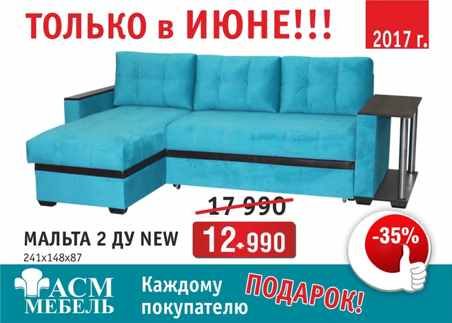 Мебель по цене пары башмаков или ужина в кафе для маленькой компании? У челябинцев такой шанс теперь есть. Чтобы в этом убедиться, достаточно посетить любой из четырёх недавно открытых магазинов группы компаний «АСМ мебель». Внутри у каждого богатый внутренний мир. Диваны прямые, угловые, кровати, спальные гарнитуры, стенки, кресла, столы. И всё это по случаю открытия сети магазинов со скидкой 35%!