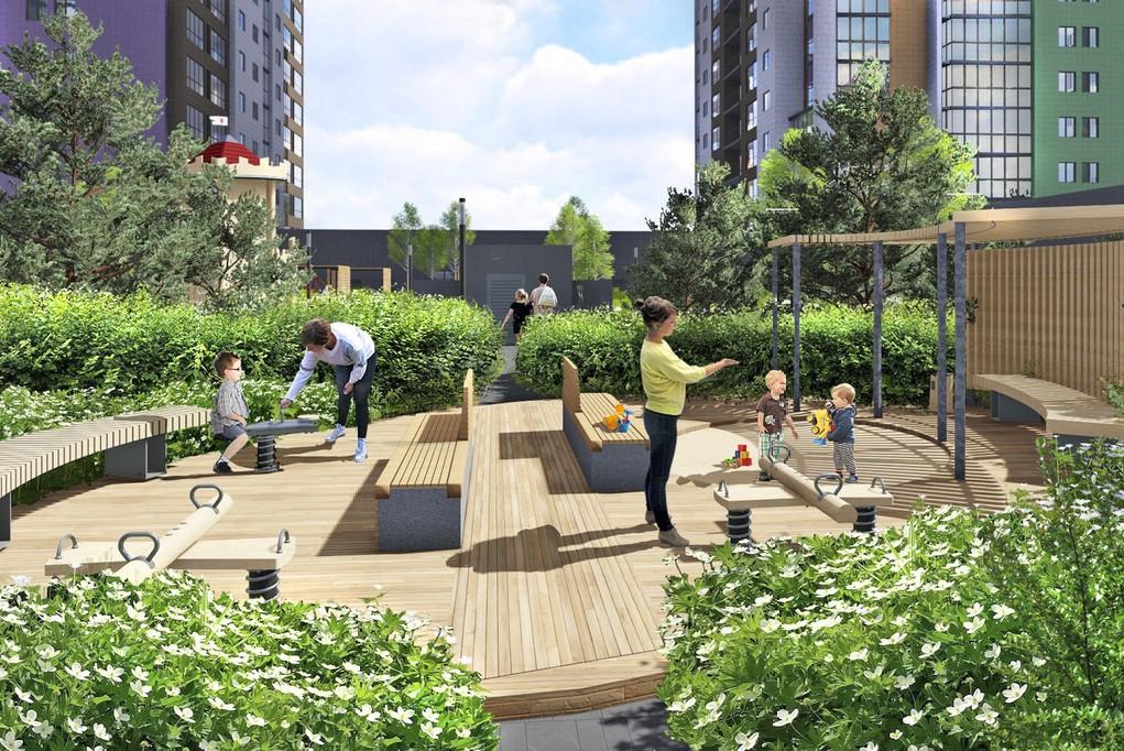Территория нового жилого комплекса напомнила челябинцам отель с хорошей анимациейЗеленые рощи вокруг добавляют отпускного настроения
