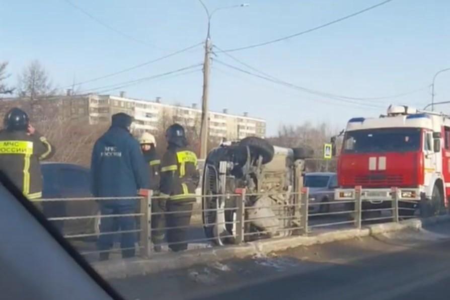 Около кольца на Шершнях, зацепив ограждение, перевернулась машинаНа месте работают сотрудники МЧС и бригада скорой помощи